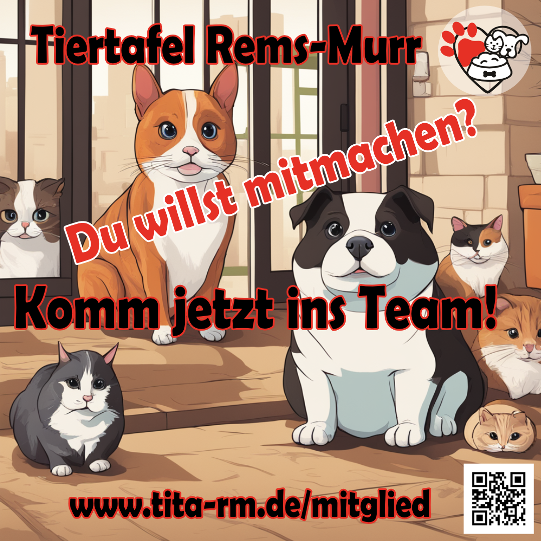 Seit etwa einem Jahr laufen Planungen, Vorbereitungen zum Tiertafel Start.In dieser Zeit meldeten sich einige Personen die an einer aktiven Mitarbeit interessiert waren. Hier kommt der Aufruf an Euch: ES GEHT LOS, KOMMT INS TEAM! Wir bitten alle Interessierten zukünftigen Tiertafel HelferInnen, sich erneut bei uns zu melden und folgenden Termin wahrzunehmen: Sonntag 18.02.202417:00 UhrAWO BacknangAspacher Str. 3271522 Backnang Die Aufgaben sind vielfältig:Lagertätigkeiten, Futterausgabe, Fahrdienste, Veranstaltungen und Infotische usw durchführen, Spendensammeln, Vernetzung, Grafikdesign, Planung/Organisation/Verwaltung…. usw. Hast Du Rückfragen?